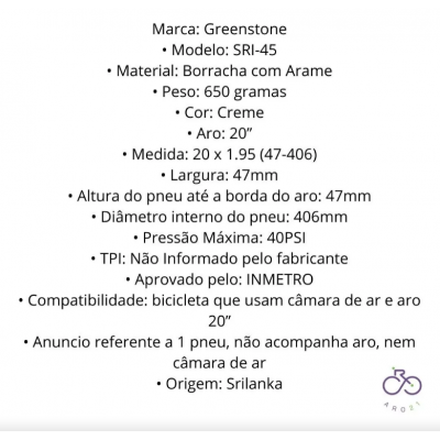 Pneu de bike BMX aro 20' x 1.95 Greenstone SRI-45 Creme 47-406